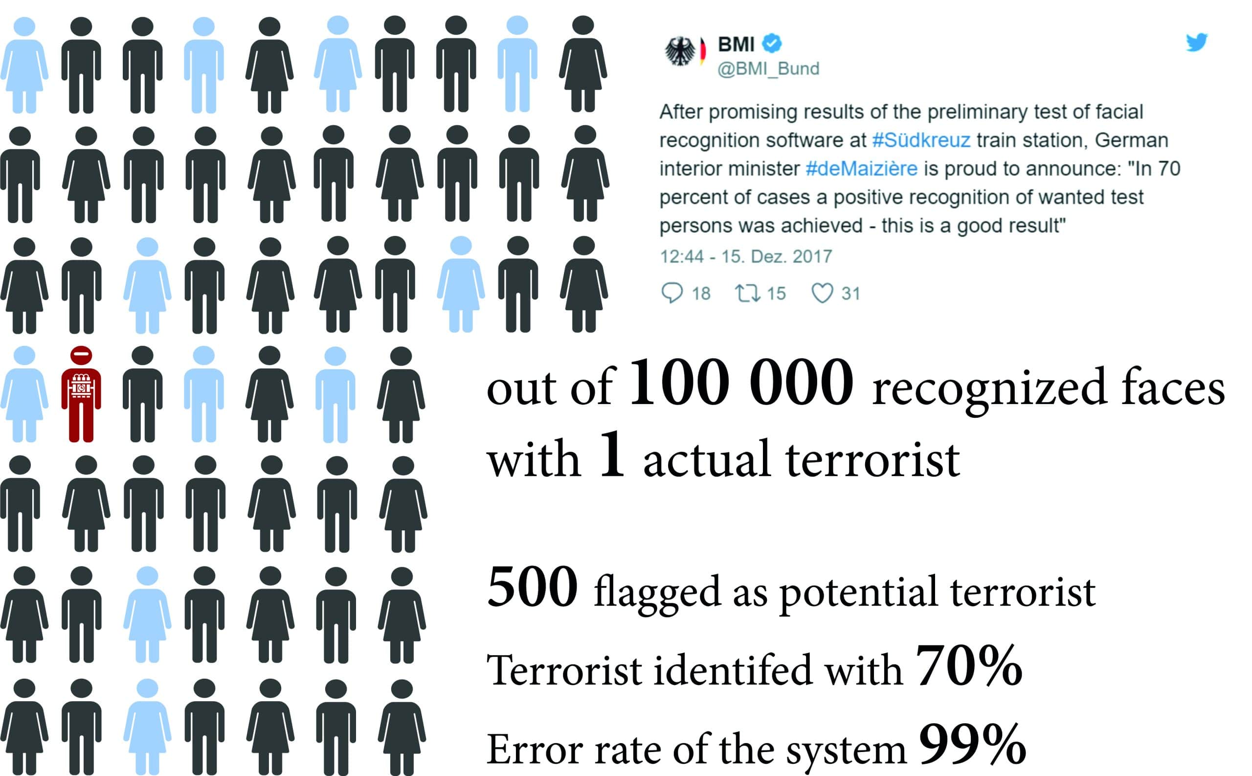 What they fail to reveal is that their acclaimed 70 % recognition rate is piteous in a real world scenario. With an assumed (and very modest) false positive rate of 0.5 % the error rate of such a surveillance system would be about 99 % and almost exclusively, innocent persons would be flagged.